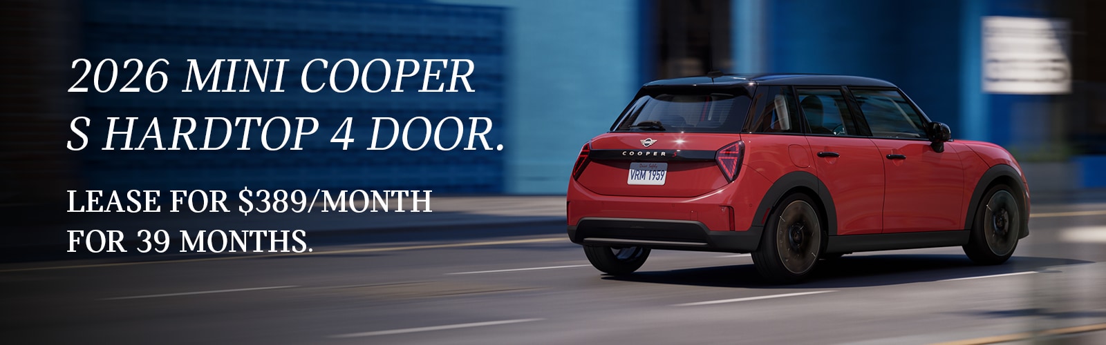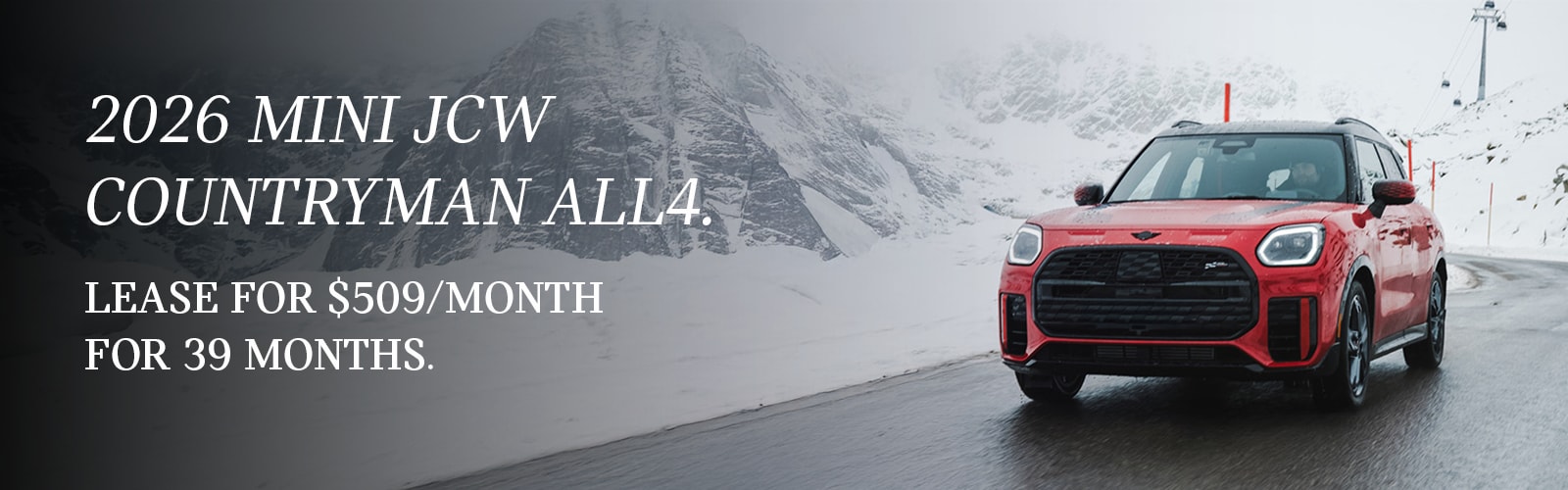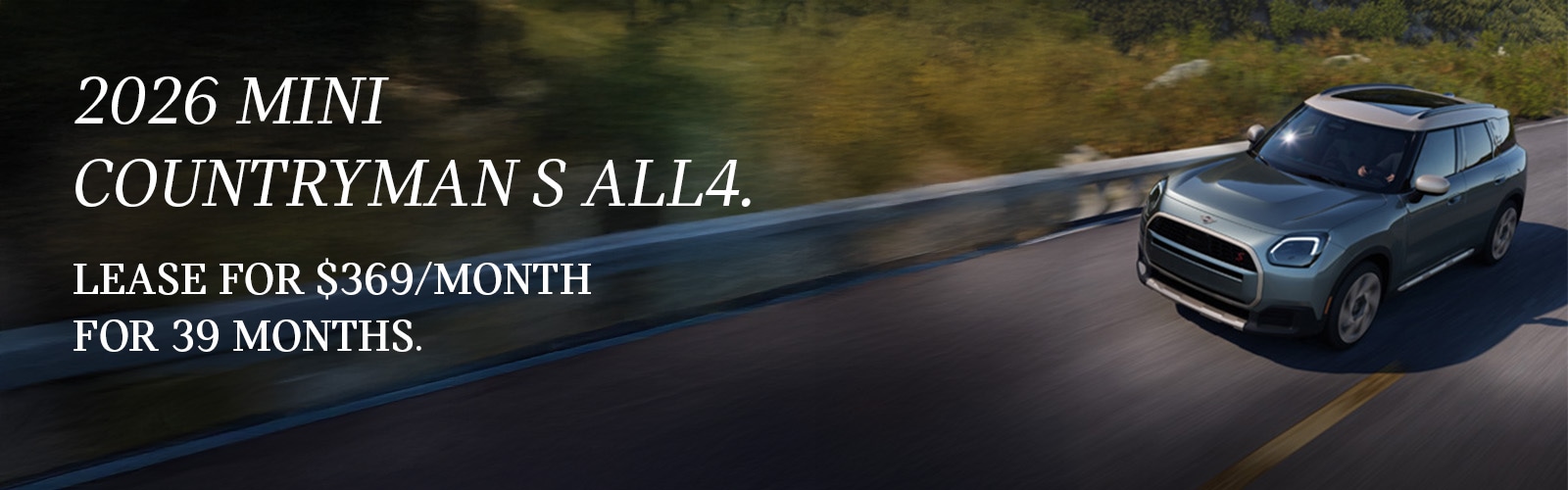 Through January 02, 2026, lease offer available on new 2026 MINI Countryman S ALL4 models from participating MINI Dealers through MINI Financial Services, a Division of BMW Financial Services NA, LLC, to customers who meet MINI Financial Services' credit requirements. Offer not valid in Puerto Rico. Monthly lease payments of $369 per month for 39 months is based on an adjusted capitalized cost of $34,516 (MSRP of $40,075, including Signature Plus Trim and destination & handling fee of $1,175, less $2,959 capitalized cost reduction, $0 security deposit and suggested dealer contribution of $1,600 and $1,000 Lease Credit). Actual MSRP and dealer contribution may vary and could affect your monthly lease payments. Cash due at signing includes $2,959 capitalized cost reduction, $369 first month's payment, $925 acquisition fee and $0 security deposit. Lessee responsible for insurance during the lease term, excess wear and tear as defined in the lease contract, $0.25/mile over 24,375 miles (7,500 miles/year) and a disposition fee of $395 at lease end (not to exceed an amount permissible by law). Disposition Fee may vary by state. Not all customers will qualify for security deposit waiver. Tax, title, license, registration and dealer fees are additional fees due at signing. Advertised monthly payment does not include applicable taxes. Purchase option at lease end is $25,247 plus Purchase option fee disclosed in the lease contract. Additional tax, title, and government fees may also apply. Other credits for loyal customers may apply. National Credit not combinable with MINI Loyalty Credits. Offer valid through January 02, 2026 and may be combined with other offers unless otherwise stated. Models pictured may be shown with metallic paint and/or additional accessories. Visit your authorized MINI Dealer for important details. ©2025 MINI USA, a Division of BMW of North America, LLC. The MINI name, model names and logo are registered trademarks. MINI Financial Services, a Division of BMW Financial Service NA, LLC, NMLS #2738.