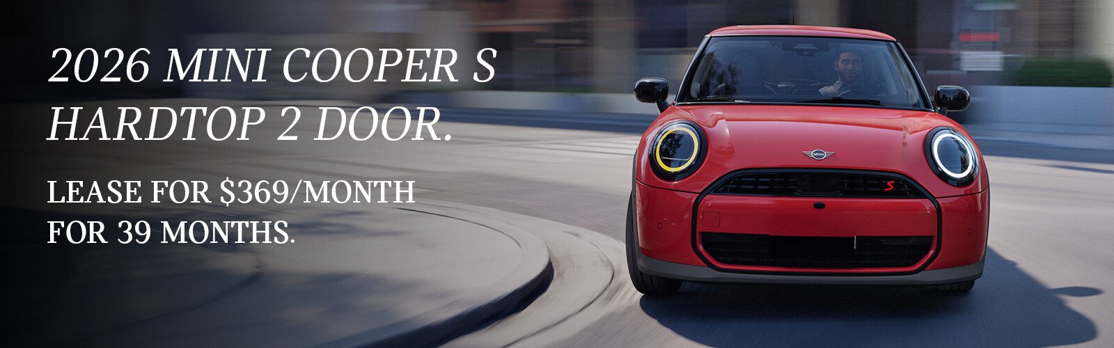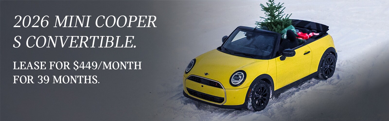 Through January 02, 2026, lease offer available on new 2026 MINI Cooper S Convertible models from participating MINI Dealers through MINI Financial Services, a Division of BMW Financial Services NA, LLC, to customers who meet MINI Financial Services' credit requirements. Offer not valid in Puerto Rico. Monthly lease payments of $449 per month for 39 months is based on an adjusted capitalized cost of $37,548 (MSRP of $41,475, including Signature Plus Trim and destination & handling fee of $1,175, less $3,177 capitalized cost reduction, $0 security deposit and suggested dealer contribution of $750). Actual MSRP and dealer contribution may vary and could affect your monthly lease payments. Cash due at signing includes $3,177 capitalized cost reduction, $449 first month's payment, $925 acquisition fee and $0 security deposit. Lessee responsible for insurance during the lease term, excess wear and tear as defined in the lease contract, $0.25/mile over 24,375 miles (7,500 miles/year) and a disposition fee of $395 at lease end (not to exceed an amount permissible by law). Disposition Fee may vary by state. Not all customers will qualify for security deposit waiver. Tax, title, license, registration and dealer fees are additional fees due at signing. Advertised monthly payment does not include applicable taxes. Purchase option at lease end is $25,715 plus Purchase option fee disclosed in the lease contract. Additional tax, title, and government fees may also apply. Other credits for loyal customers may apply. National Credit not combinable with MINI Loyalty Credits. Offer valid through January 02, 2026 and may be combined with other offers unless otherwise stated. Models pictured may be shown with metallic paint and/or additional accessories. Visit your authorized MINI Dealer for important details. ©2025 MINI USA, a Division of BMW of North America, LLC. The MINI name, model names and logo are registered trademarks. MINI Financial Services, a Division of BMW Financial Service NA, LLC, NMLS #2738.